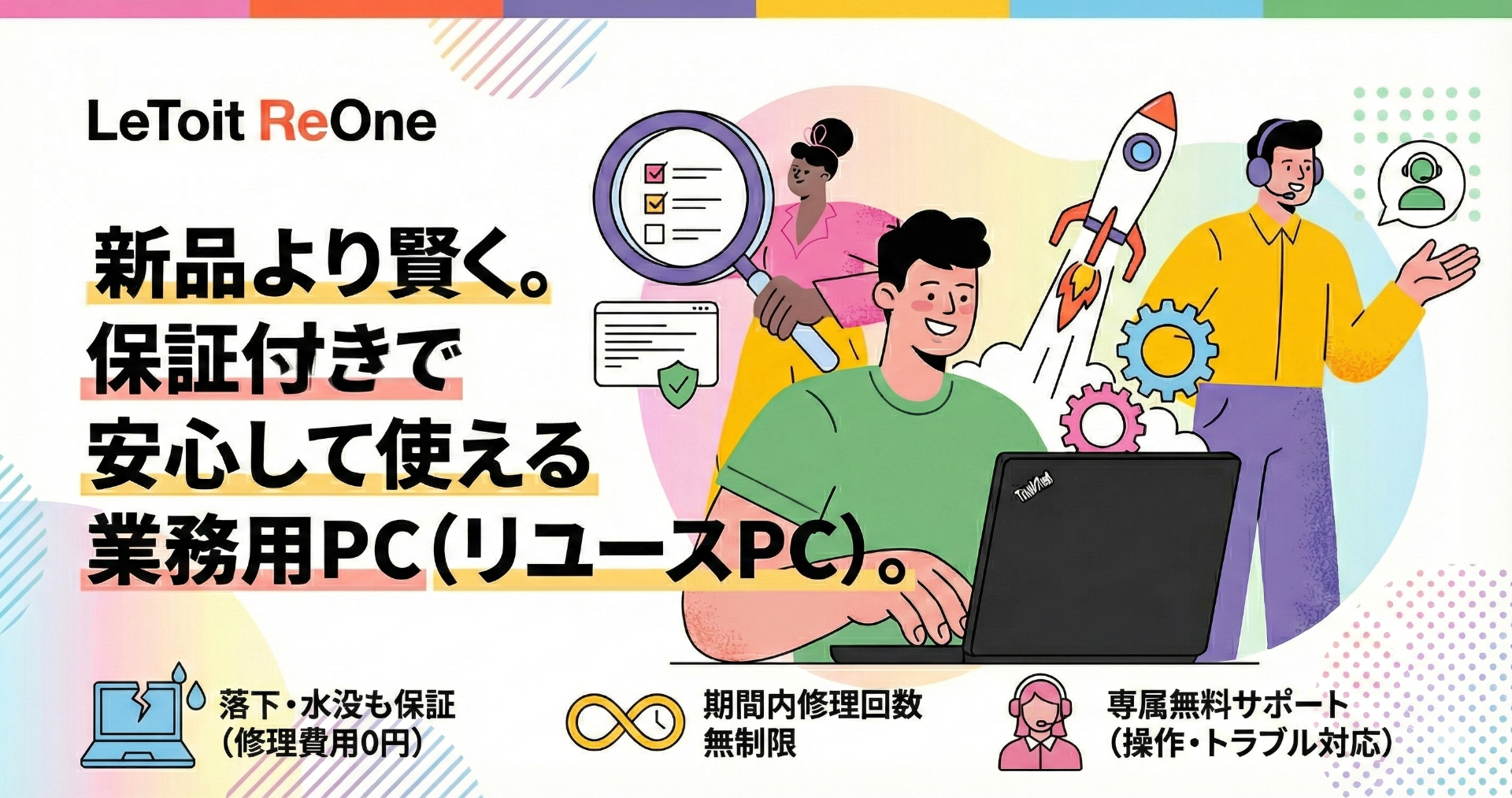 年度更新や採用増に伴うPC調達・セットアップに追われ、本来注力すべき企画・改善業務が後回しになりがちです。業務利用に必要な性能を備えた高品質な中古PCを、専門スタッフが再整備・検証したうえで、すぐに利用できる状態でご提供致します。新品調達と比較してコストを抑えながらも、再整備品質と安定稼働を担保し、調達工数の削減に寄与します。また、無期限保証やデータ消去証跡(Blancco 等)にも対応しており、導入後の不安や証跡管理の負担を軽減し、情シス業務の効率化を実現します。